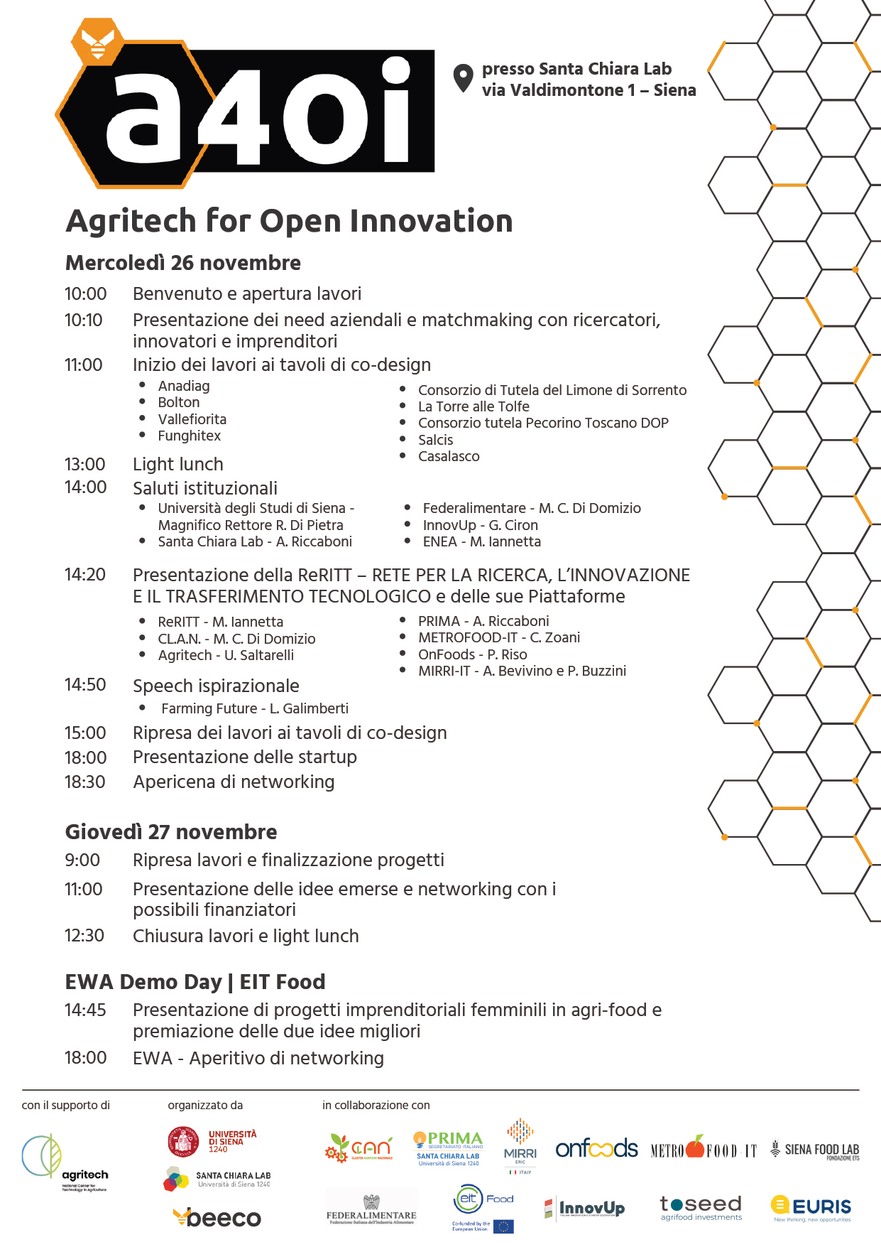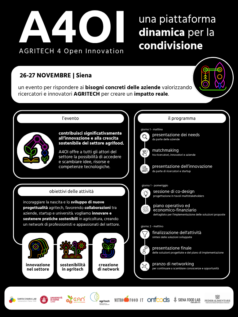 Nelle giornate di mercoledì 26 e giovedì 27 novembre 2025 si svolgerà al Santa Chiara Lab – Università di Siena la seconda edizione dello Spoke 9 di A4OI – Agritech 4 Open Innovation