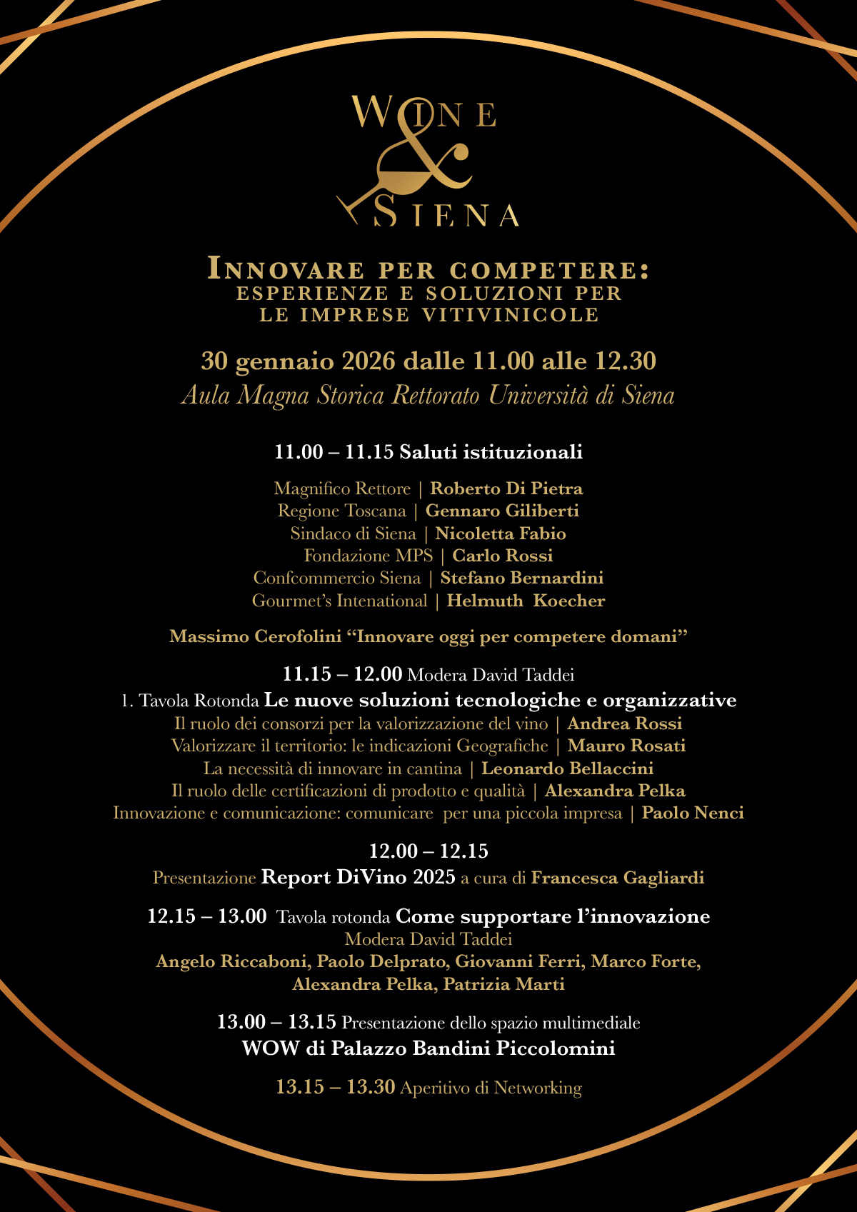 Venerdì 30 gennaio 2026 presso l’Aula Magna Storica Rettorato Università di Siena, nell’ambito di Wine&Siena, si terrà l’incontro “Innovare per competere: esperienze e soluzioni per le imprese vitivinicole” durante il quale interverrà il Presidente del Santa Chiara Lab - Università di Siena prof. Angelo Riccaboni.